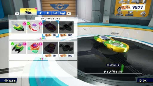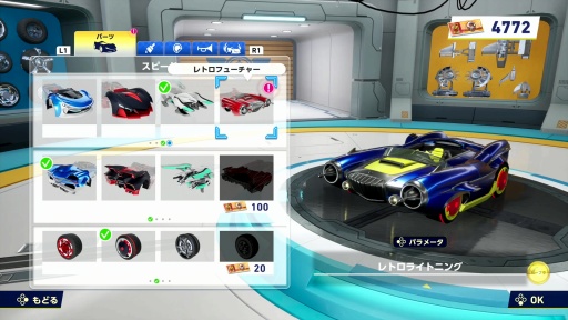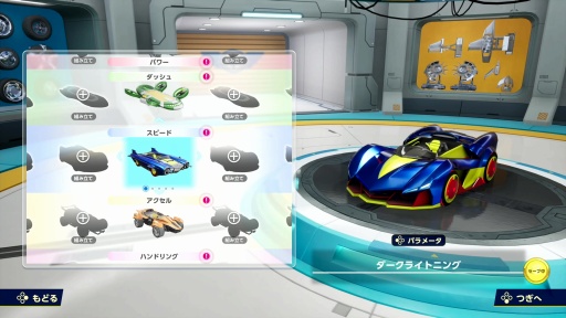 レースの前にはマシンのカスタマイズが可能だ。マシンは「スピード」「アクセル」「ハンドリング」「パワー」「ダッシュ」のカテゴリに分かれていて,車体の形状やカラーリング,ステッカー,クラクション,オーラといったパーツを交換できる。パーツはレースで稼いだ「チケット」と引き換えに入手することになるようだ。