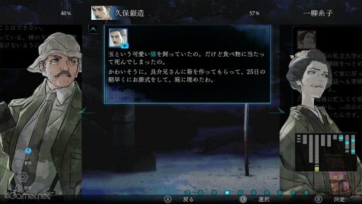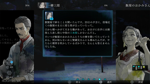 画面には事件関係者が登場し,その供述がテキストで表示される。文中に水色で示された単語は事件の要点であり,選択することで新たな供述を引き出せる。