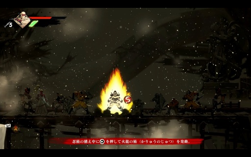 敵を攻撃して忍法ストックを増やし,忍法や手裏剣で処刑ゲージを溜めたらシノビ・エクスキューションを発動し,一網打尽にすると忍術ゲージが増えていく。複数の要素がリソースによって相互につながり,さらに敵を叩き落すと一撃で倒せる湖,吹っ飛ばすと爆発を起こすドラム缶といった環境の要素も存在する。さまざまな手段を駆使すればするほど,バトルは有利かつ面白くなっていく。