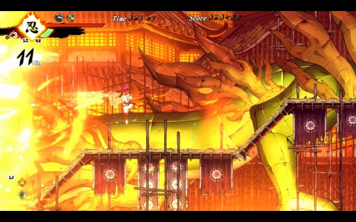 手描き風のアートワークは,和の雰囲気をこれでもかと漂わせる。朧の里ではススキがたなびく草原,うっそうとした竹林,雪の寺院,薄暗い建物内へと場面が移り変わる。提灯祭りでも郊外の沼から花火が輝く和風都市,建築現場,巨大な山車が群れなす街路といったように,ステージ内でも次々にロケーションが展開するため,プレイヤーをまったく飽きさせない。