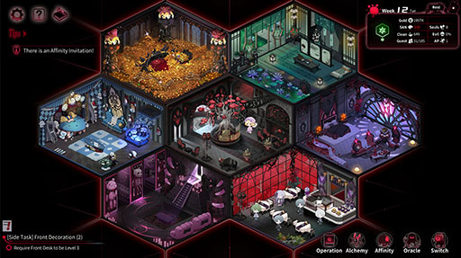 この物語は、闇に包まれた負債を背負う古の館を継承するところから始まります。死神、ドラゴン、斬霊師、アンドロイドメイドといった異形のスタッフたちを雇い、ホテル経営に挑戦することになります。謎めいた客人たちが次々と訪れ、それぞれが不可思議な出来事を引き起こします。採掘、冒険、錬金術、レストラン経営など、あらゆる手段を駆使して財を成しましょう。神託(オラクル)の予言に基づいて戦略を調整できますが...