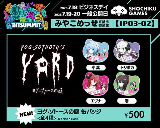 このたび、2025年7月18日(金)〜20日(日) 京都市勧業館みやこめっせにて開催される「BitSummit the 13th」に本作も出展することをお知らせいたします。松竹ブースでは日本語実装されたデモ版を特別に先行試遊体験ができます。そして、日本初の公式グッズ販売やオリジナルノベルティカードも配布予定で、存分に『ヨグ=ソトースの庭』の魅力を発信しますのでぜひお立ち寄りください!