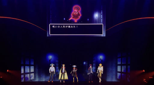 開演時間になると,スクリーンにゲーム画面が投影され,ついに冒険がスタート! まずはRPGでおなじみの「名前入力」画面が表示され,「ガク」と打ち込まれると,ステージにはマント姿の伏見さんや仲間たちが登壇した。