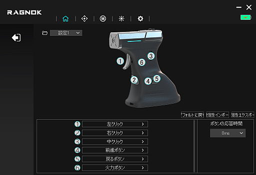 本体左側面にはマウスホイール(およびホイールクリック)と進むボタン,戻るボタン,連射できる発射ボタンがある。いずれも親指で操作しやすい位置にあり,トリガー以外のボタンは専用アプリケーション「Ragnok ErgoStrike7」でキーアサインが行える。
