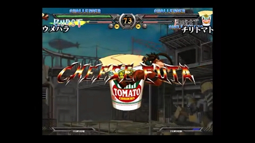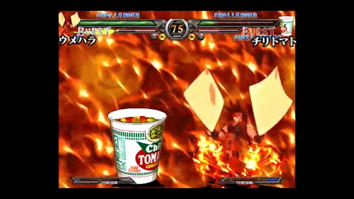 本CMでは,プロゲーマーの梅原大吾(ウメハラ)氏が,2002年にリリースされた格闘ゲーム「GUILTY GEAR XX」風の対戦画面で,カップヌードルのチリトマト味にチーズを乗せるというアレンジレシピを紹介している。