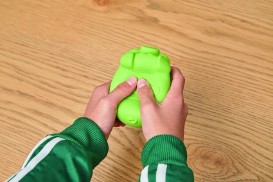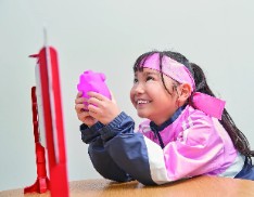 ラケットとして使うブタは,ボディを押すと鼻息が出て,その風力で羽根を飛ばせる。羽根はポリエチレン素材で軽く,丸い形状なので,空気の当たる角度と強さによって,思いも寄らぬ動きで飛んでいく。相手のコートから返ってきた羽根を落とさないように吹き返そう。ブタは4個用意されているので,2対2のダブルスも楽しめる。