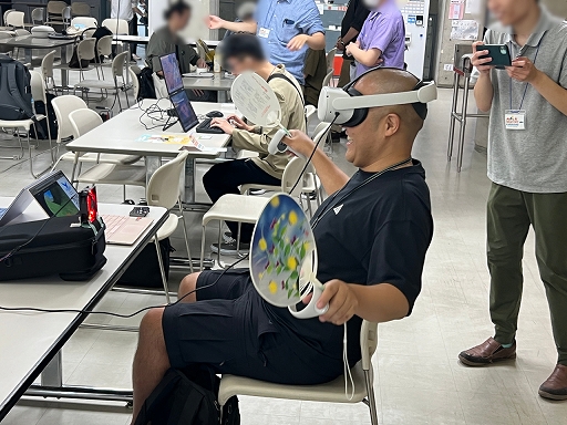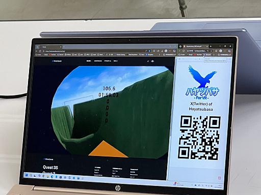![]() 東京工科大学の学生・有竹氏(@AritakeLAB)が制作する「ハヤツバサ」はVRゴーグルをかぶり,うちわを付けたコントローラを振ることで,翼ではばたく手応えを得られる飛行体験シミュレーター。飛ぶスピードに応じて前方のファンから吹く風の強さまで変化する,かなり本格的な内容だった |